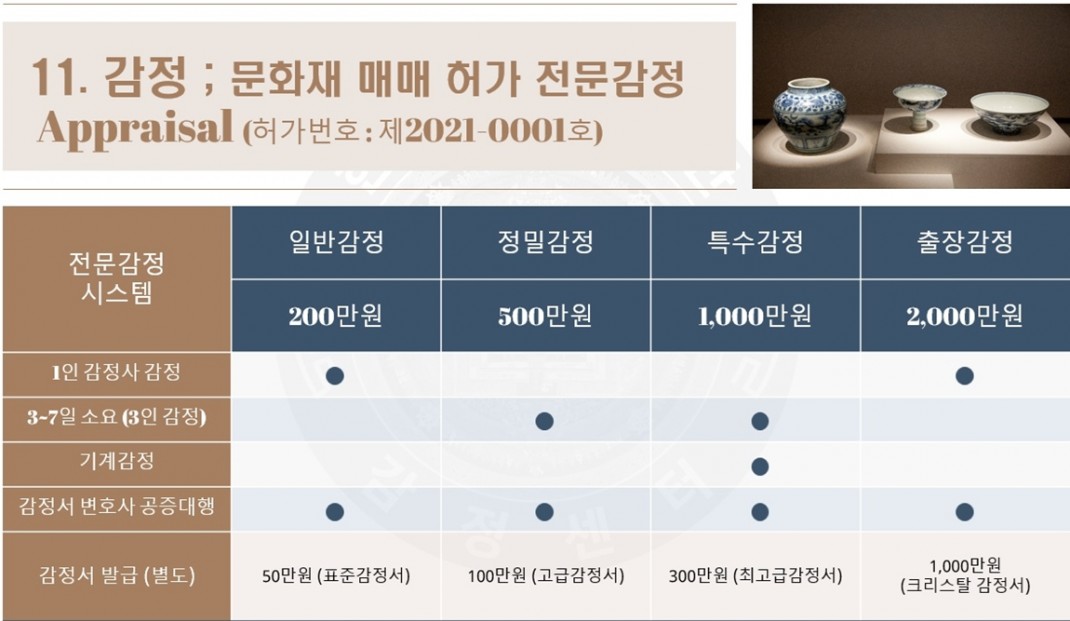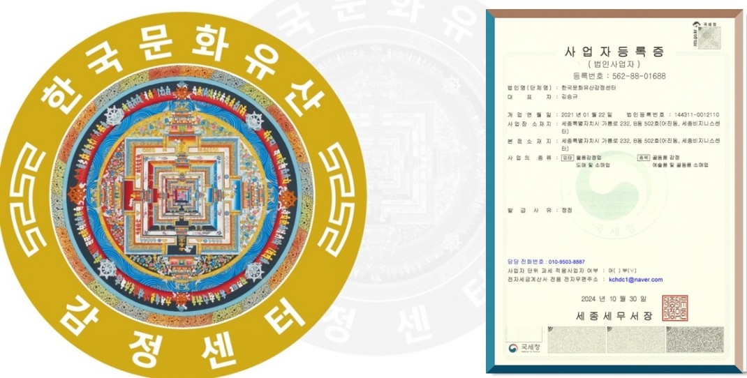 한국문화유산감정센터 (문화유산매매업 허가법인)세종시 가름로 232 세종비즈니스센터 B동 502호TEL: 1661-0074 /